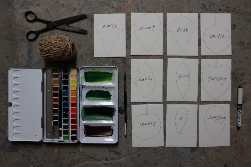 Draw the outlines of leaves on each of the ten pieces of paper. You could use a tree identification book so that your leaves are true to nature, or search online for stylised shapes. Make sure there’s enough room for your words to fit inside the leaf shape….if you have a long word, draw a large leaf!