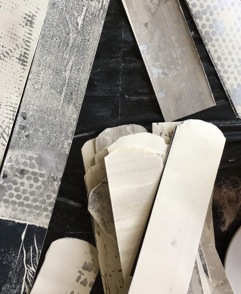 Today is all about continuing to fill the pages with your text and texture, print and paint. Our table will be completely covered with work-in-progress! Collate each section of folded papers, so that they are in the right order and the right way up.