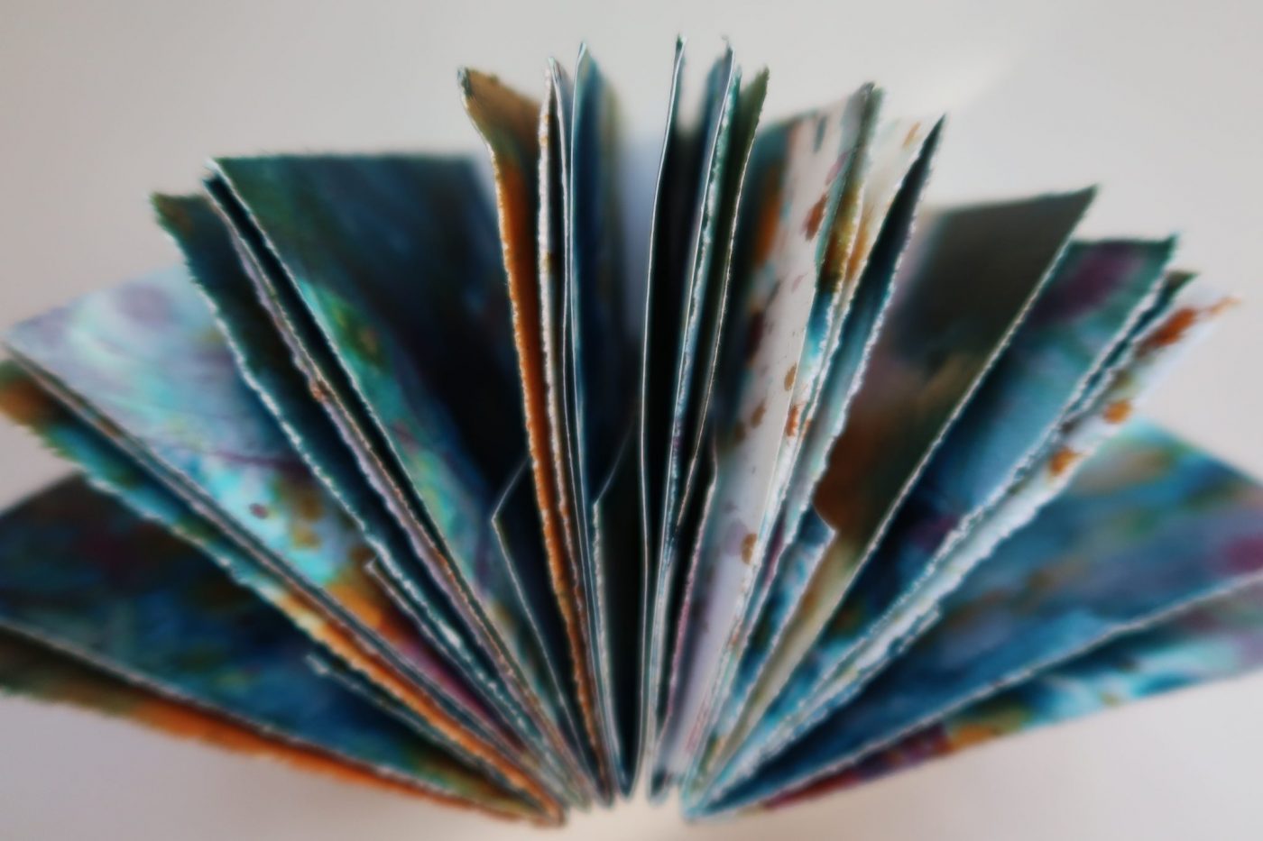 The main binding structure we’ll use is a variation of the Slit Slot book in Bound, developed to incorporate a variety of text and inkery, collage and colour.